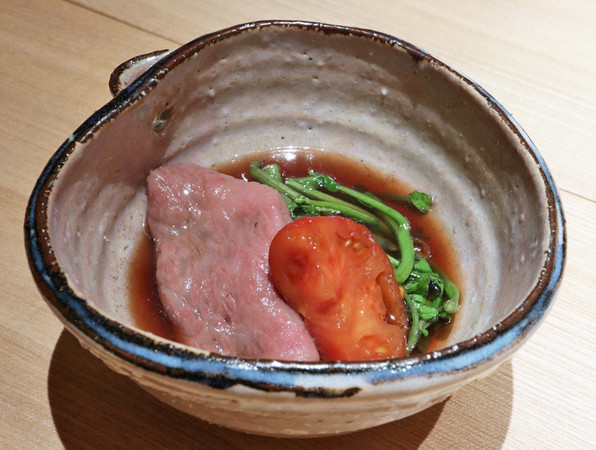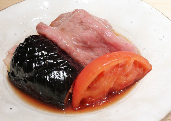 ●赤ワイン鍋とは、おだしと赤ワインを合わせただしで楽しむものです。具材は牛肉、他に茄子、トマト、クレソンと具材少なめシンプル。