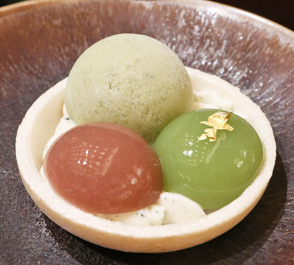 新茶のもなか(新茶とミントのアイスクリーム、新茶の生ういろう、こしあんの生ういろう、下にこしあんを混ぜ込んだクリーム)