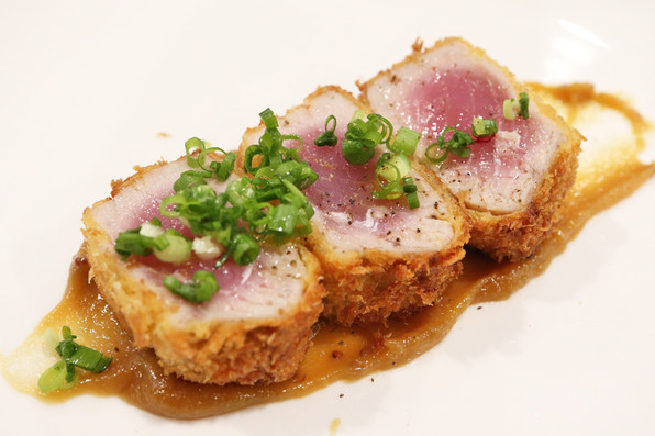 ●しびまぐろのひと口レアカツレツ。下にすごい酢を使った酢味噌。カツレツの揚げ加減ジャストです。下の酢味噌がもうれつおいしい(*_*)(*_*)(*_*)