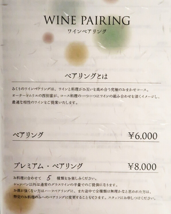 コースは1万円、ワインペアリングは6千円か8千円。もちろん1~2杯だけというのでも可能で、アルコールなしで、ソフトドリンクだけでも大丈夫ということ。