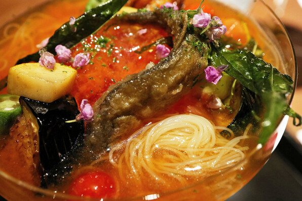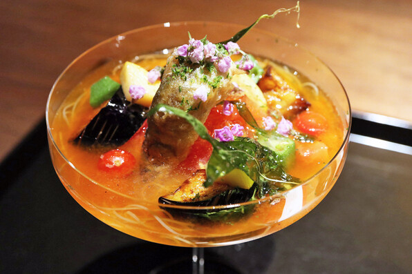 ●鮎そうめん。三輪そうめんの3年ものと。琵琶湖の鮎は唐揚げに、茄子、ズッキーニも揚げたもの。焼いたパプリカをピュレ→ソルベにしたもの。トマトウォータージュレ。おくら、フルーツトマト。たでの葉、花穂紫蘇。