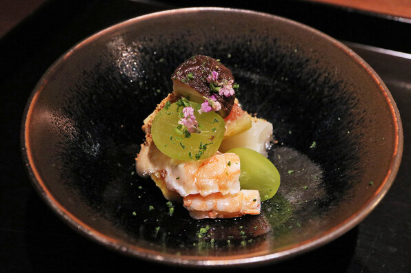 ●いちじくを油通ししたもの、白ずいき、海老(本来はあわびのところ海老に)、焼き椎茸、シャインマスカット。胡麻だれと。