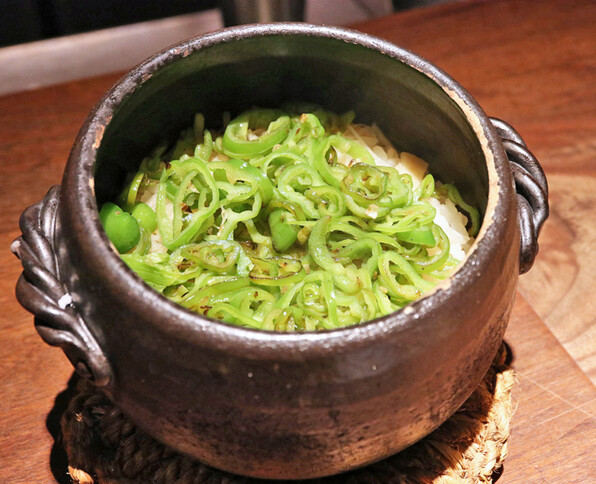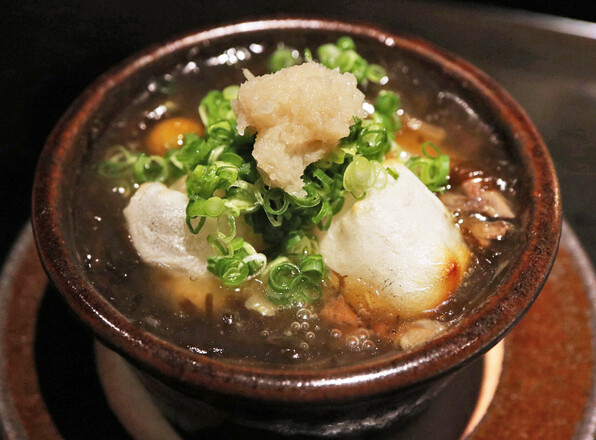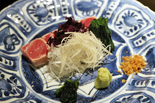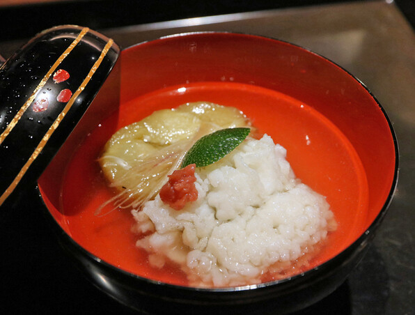 ●山科茄子を焼いたものと、淡路島・沼島の鱧。南高梅、みょうが。だしは塩分少なめに。食べ終えてちょうどいい塩梅。利尻昆布に、本枯節とまぐろ節半々使用とのこと。