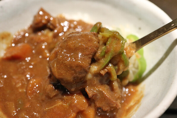●和牛に赤ワイン入りのカレーだって。ベースは日本風のカレーです。とてもおいしかった(^o^)/
