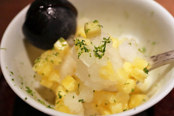●最後に氷菓。冷やしあめソルベに、パイナップル。生姜とカルダモン風味。あーさっぱりしました。