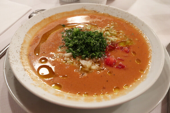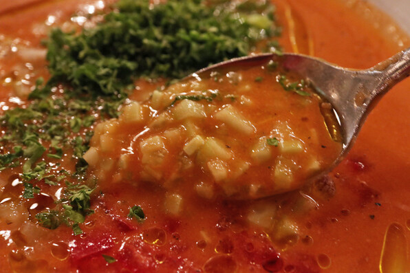 ●ガスパチョです。トマト、玉ねぎ、セロリ、きゅうりなど、細かく刻んだ野菜がみっちり入っています。