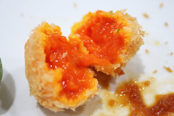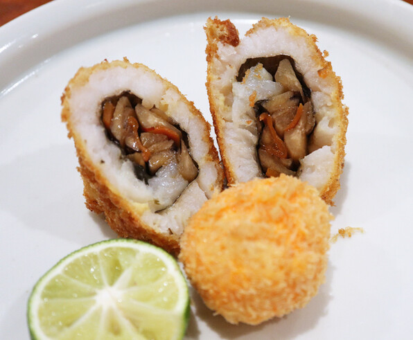 ●鱧の吉川ごぼう巻きフライ、濃紅たまご卵黄のフライ