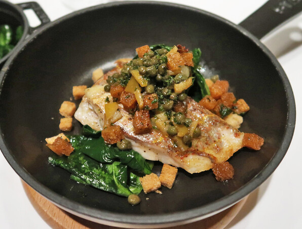 ●メインに、いとよりのグルノブロワーズ=グルノーブル風。ケイパー、クルトン、レモンの皮、焦がしバターのソースです。酸味も塩気も強くて味わい明確。