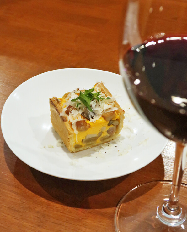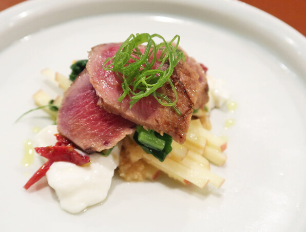 ●まぐろ炙ってづけにしたまぐろに津軽りんご、ストラッキーノ、りんご醤油のソース。