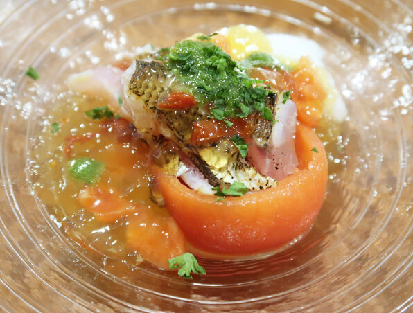 ●トマト、ドライトマトとかますに柑橘のジュレ、大葉。