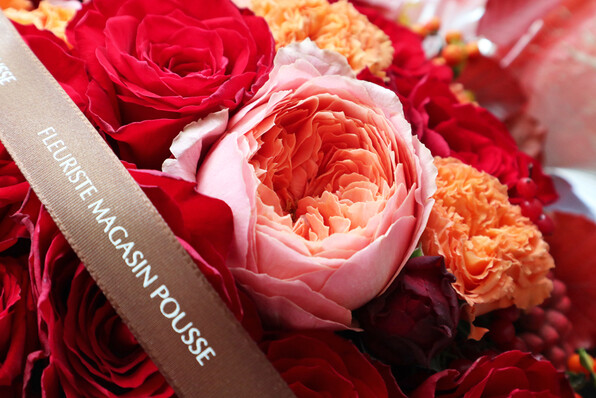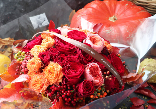 ●赤ベースに、少し秋色ニュアンスカラーを加えて、実なんかもあしらったアレンジメントをという発注をしました。