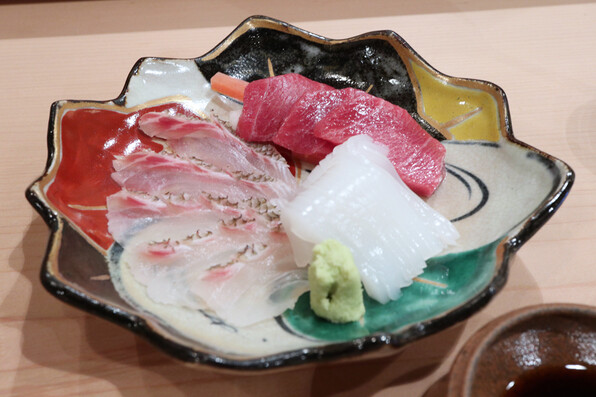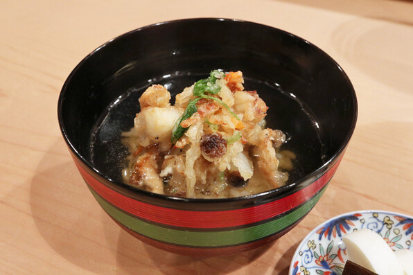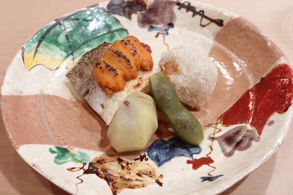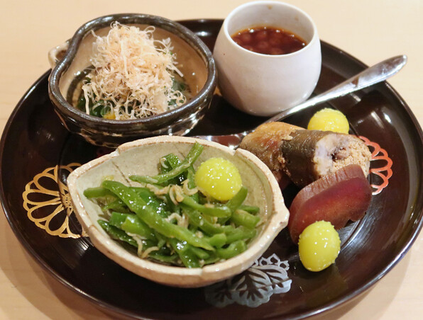 ●万願寺とうがらしとじゃこ炊いたの/ほうれん草と春菊、菊花、椎茸/筋子/子持ち鮎、からすみ、銀杏