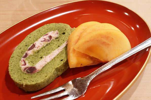 ●抹茶ロールケーキ、中に小豆クリーム。柿と。