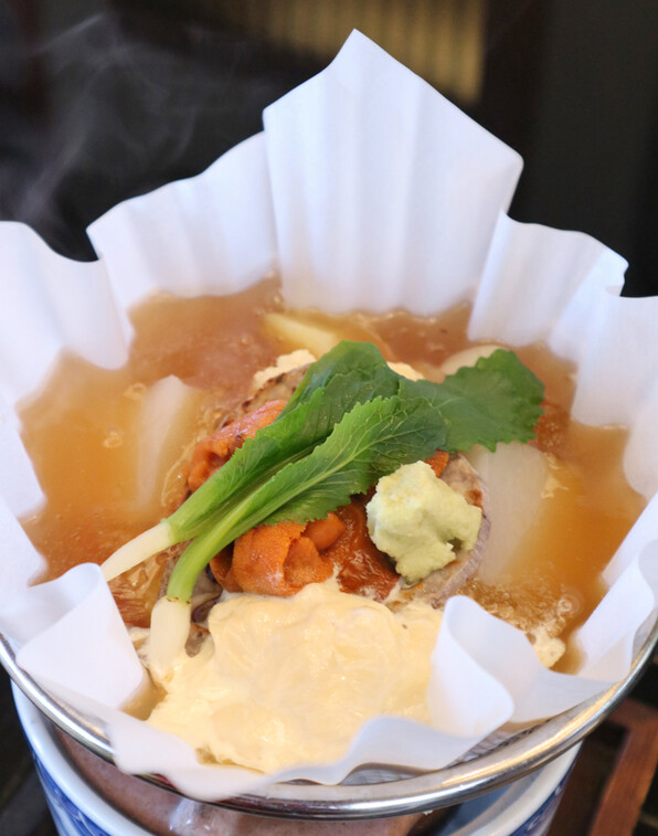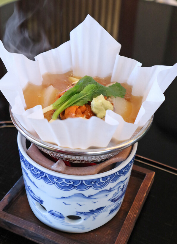 ●蕪、れんこん、にんじんなど野菜のお鍋、雲丹、湯葉。