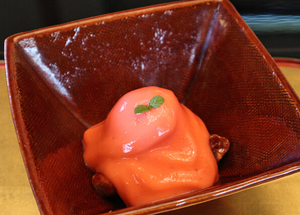 ●水物 いちごのエスプーマ、ミルクアイスクリーム、ブラジルナッツ