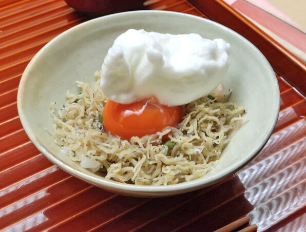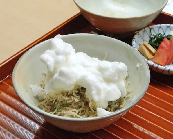 ●おじゃこご飯に卵をのせてもらう時は、、大抵「卵黄だけ」と皆さん注文されるのに、初めて「卵白だけ」という斬新な注文、、メレンゲにして出していただいた之図。
