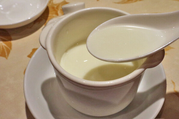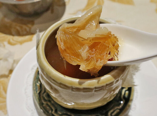 ●ふかひれ、金華ハム、干し貝柱、高麗人蔘、霊芝、鶏肉、竜眼などが入った贅沢スープ。これをいただくと身体の温まり方が違います。ぽかぽかぽかになって、それが長いこと続きます。