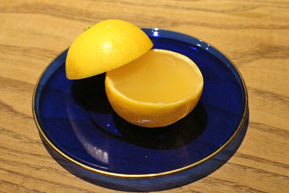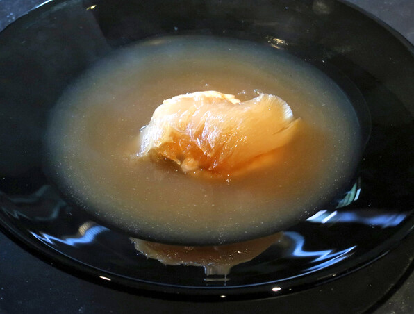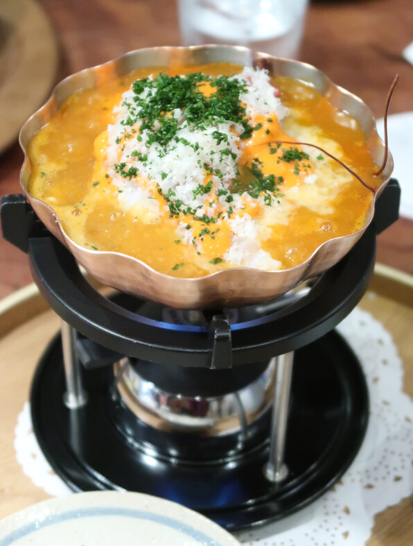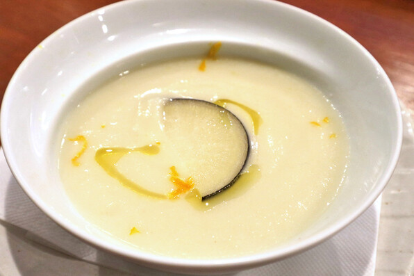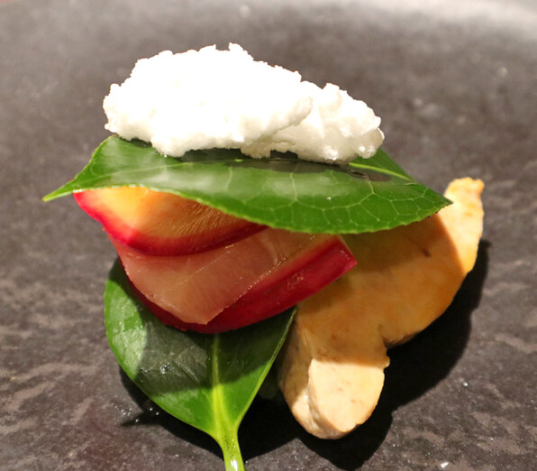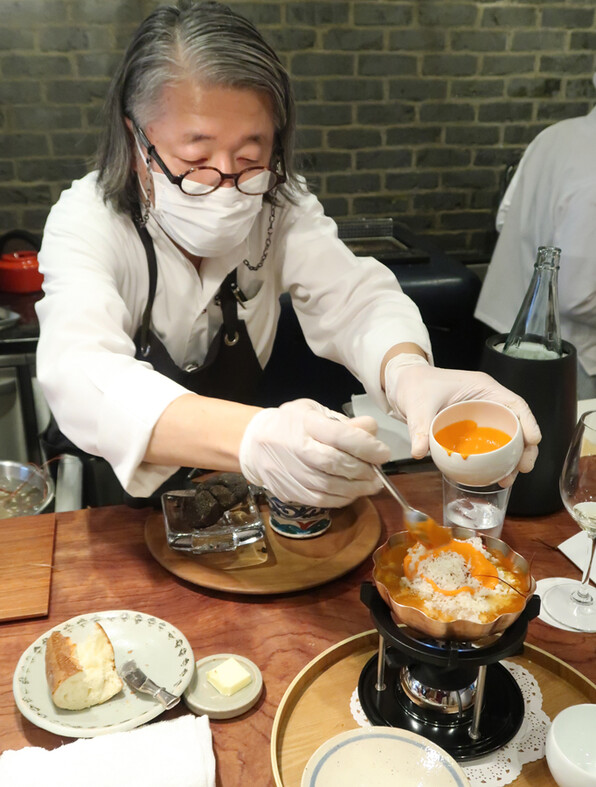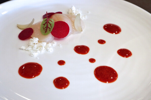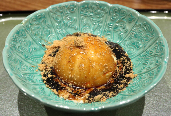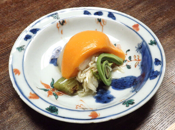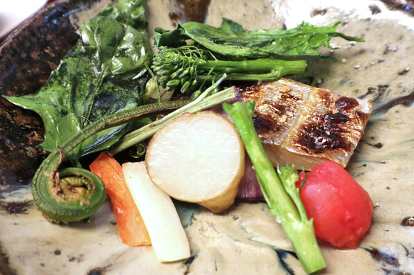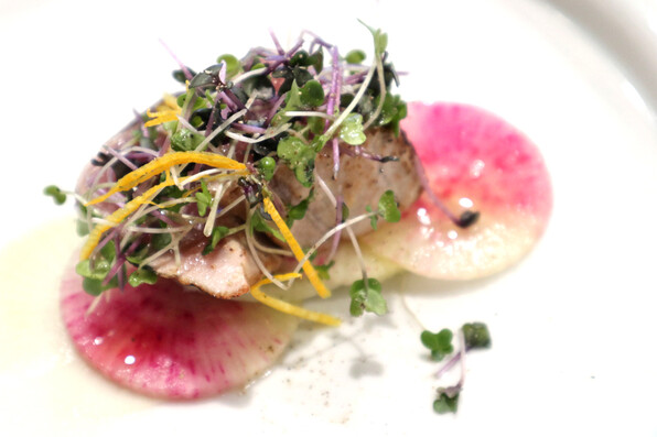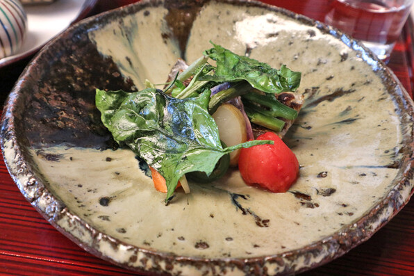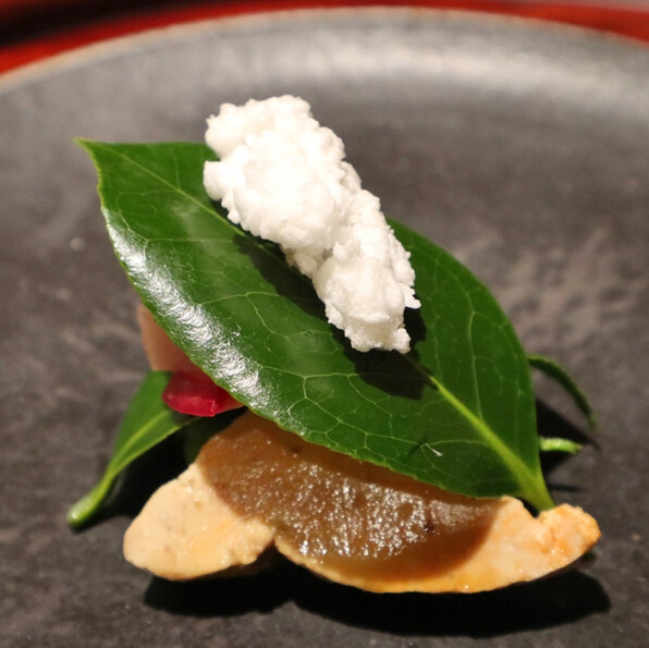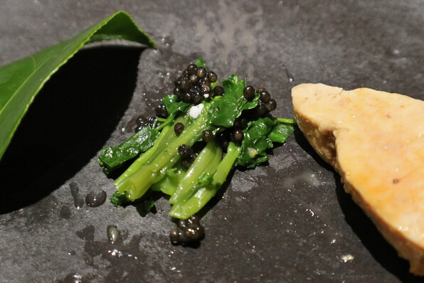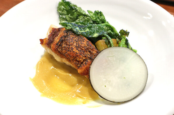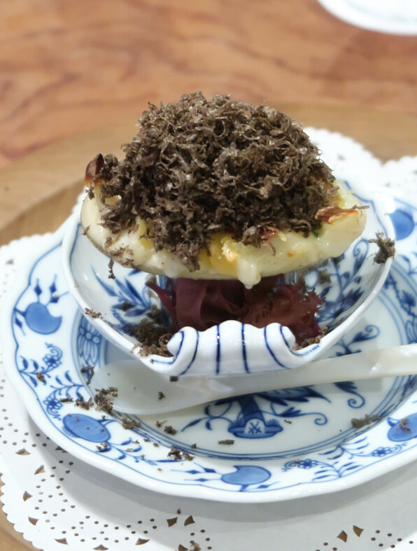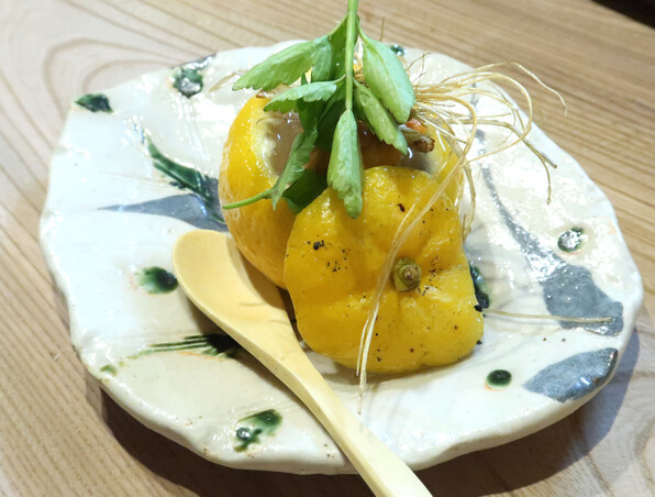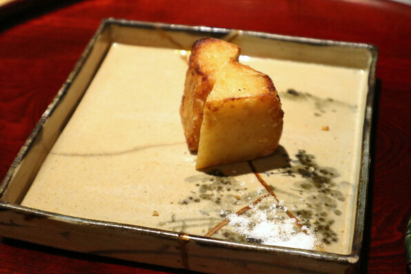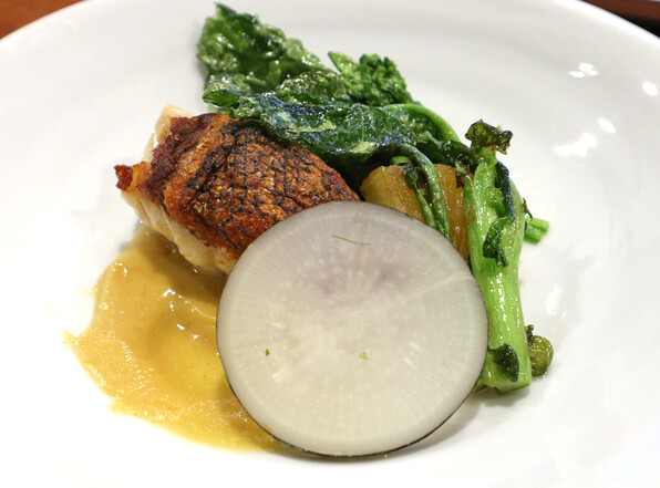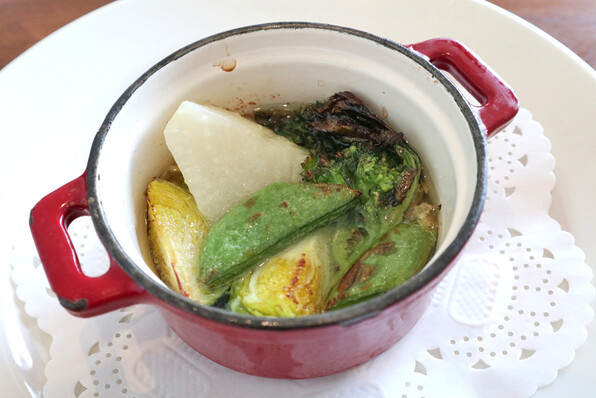 ●さらに野菜の料理で、聖護院大根のアヒージョ、香味油で煮えたぎった状態なのだけど野菜の甘みや旨味が引き立てられていてお見事。