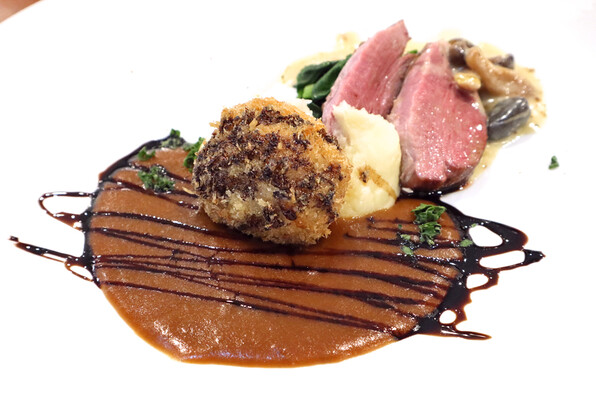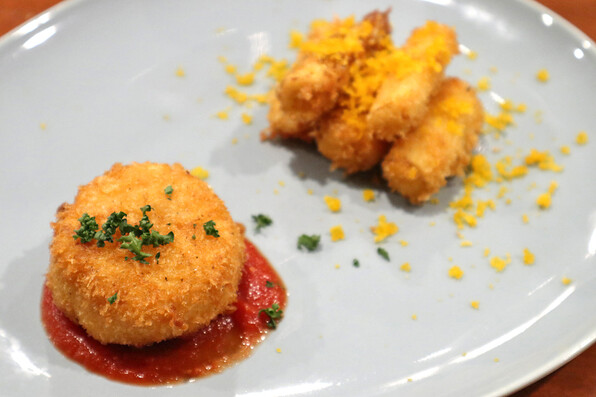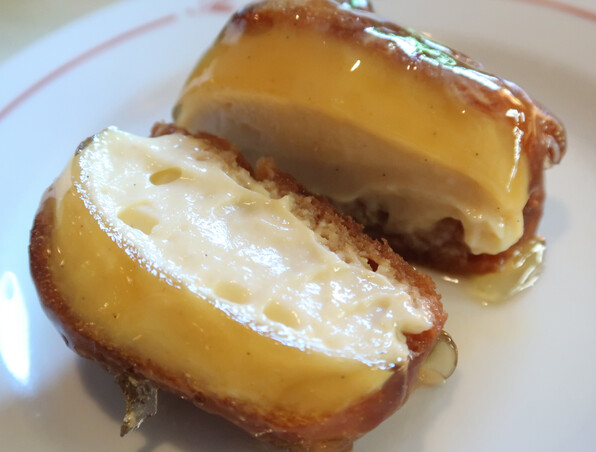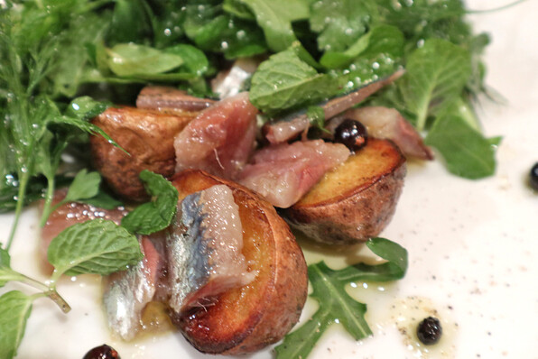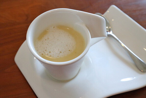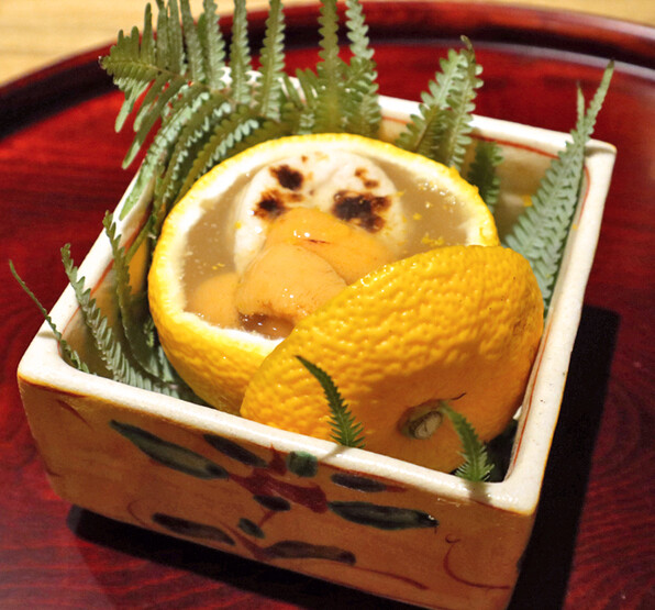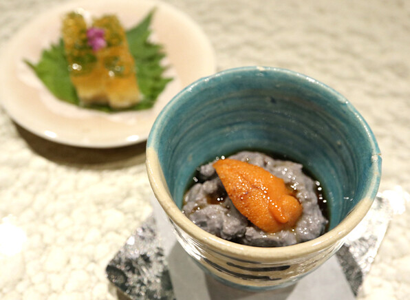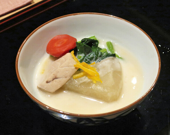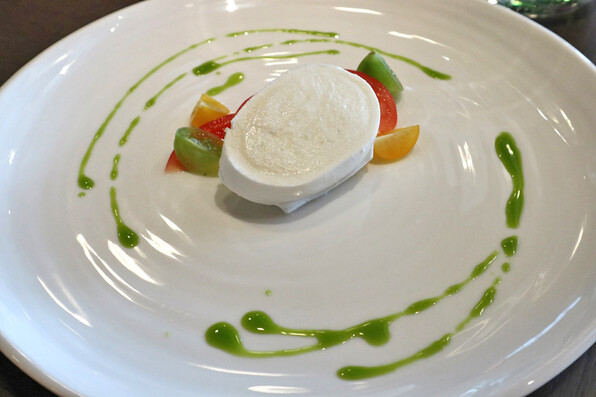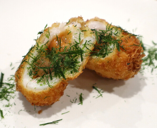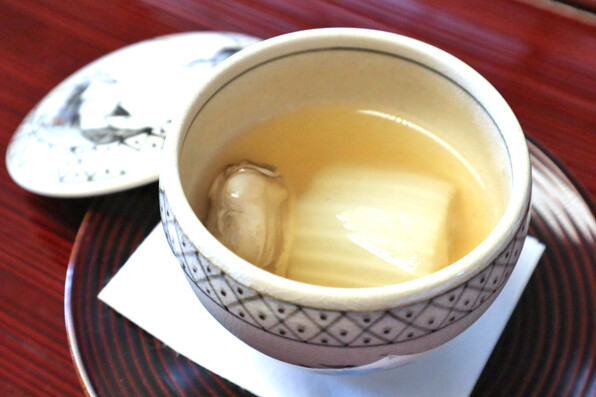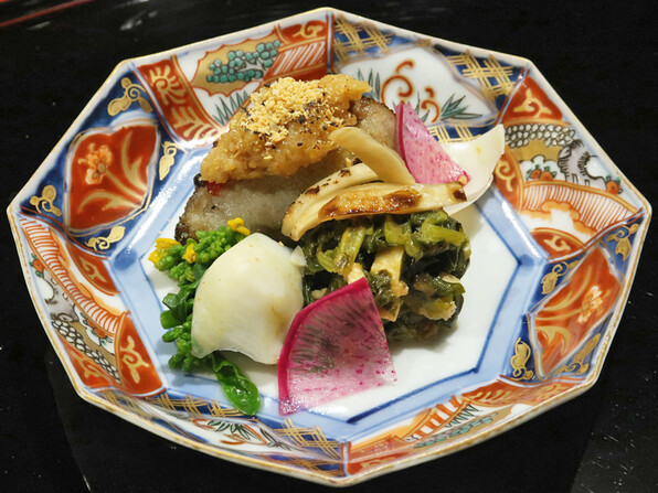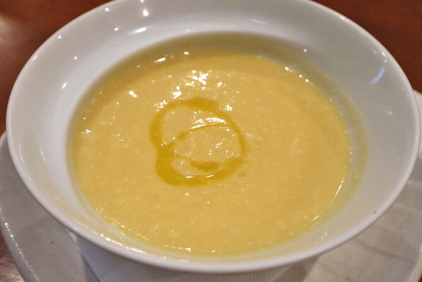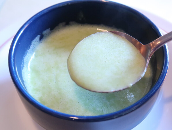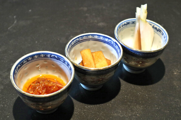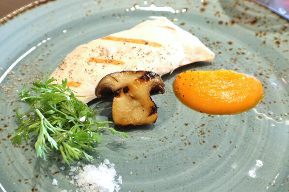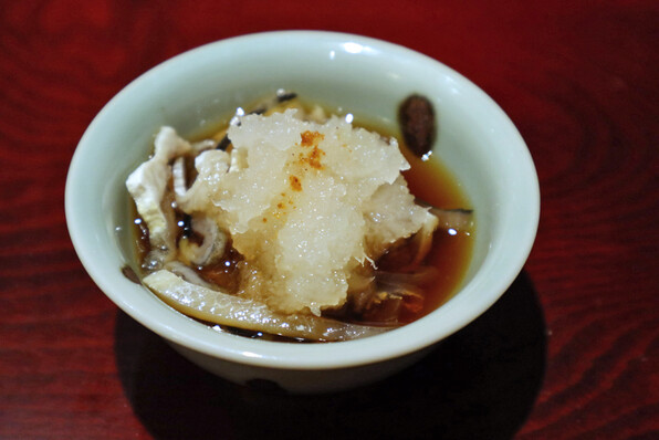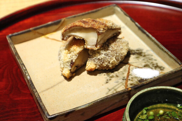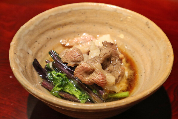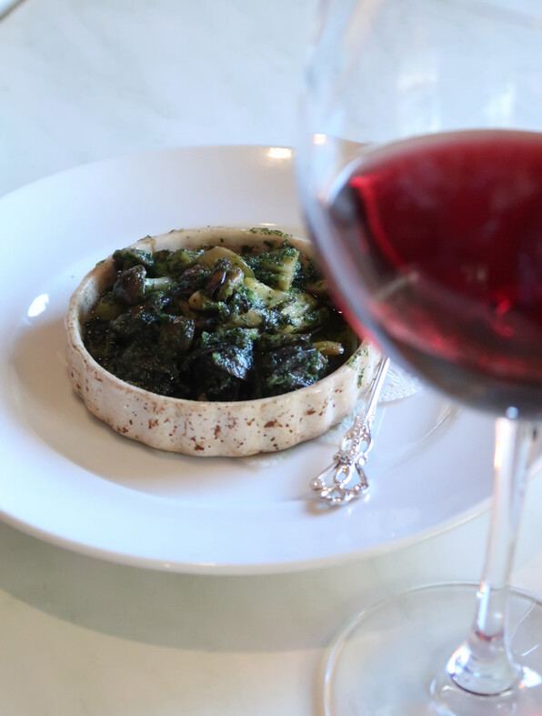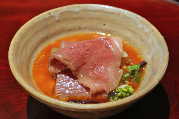 ●さらに野菜の料理で、聖護院大根のアヒージョ、香味油で煮えたぎった状態なのだけど野菜の甘みや旨味が引き立てられていてお見事。