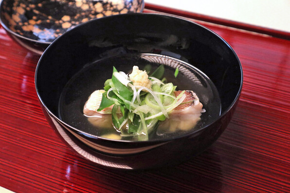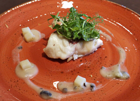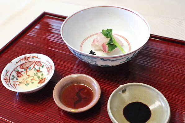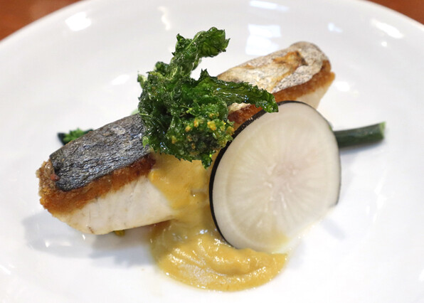 ●メイン料理には天然鯛の新キャベツ包み、ふきのとう風味 青のりソースを選択。