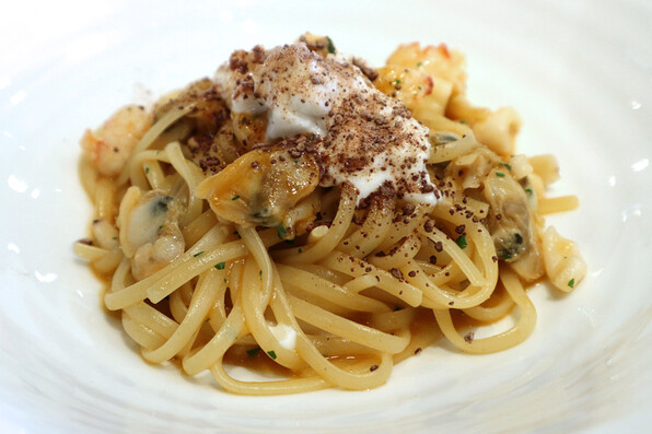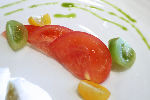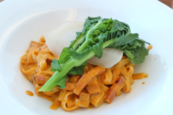 ●聖護院大根(六角農場)とトマト(丹波農場)のクリームパスタ。パスタは手打ちのひらひら麺で、食感よくとてもおいしかった(^o^)/