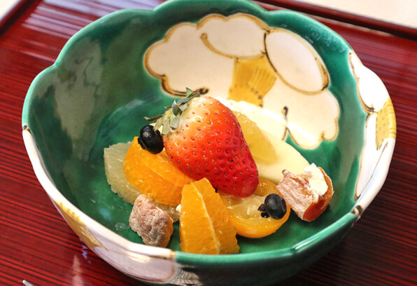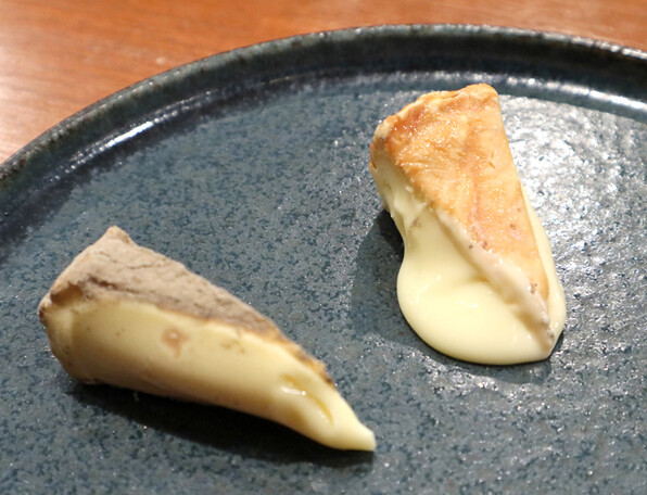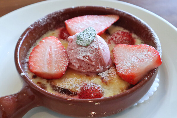 ●デセールも選択できて、これは焼き立てのチーズケーキ。上に、八百一さんの京北農場のECOいちご。