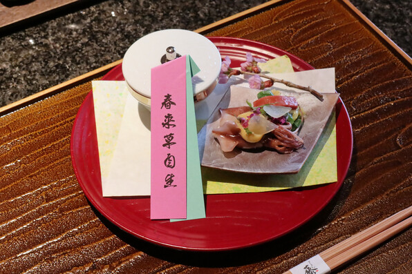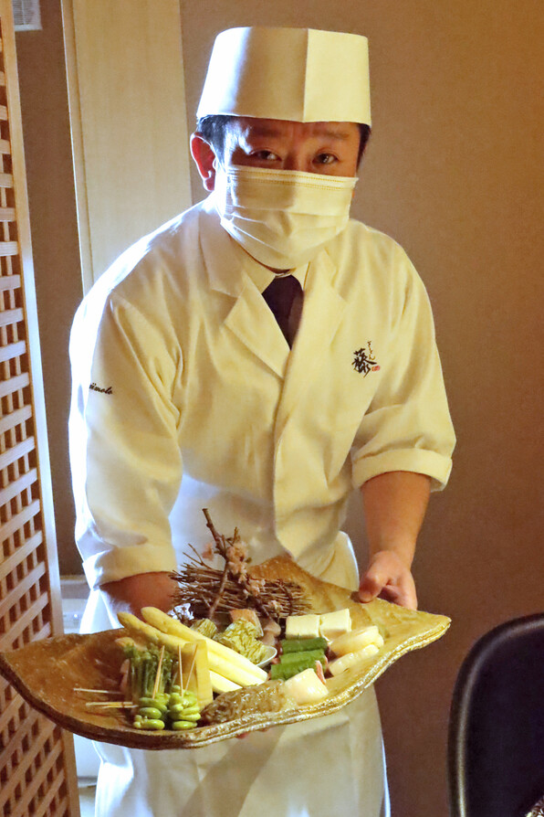 ●筍、白アスパラガスに山菜、スペシャリテの牛肉巻きも見えています。