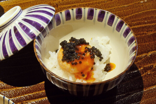 ●締めは、卵黄天ぷらにカヴィアのたまごかけご飯。