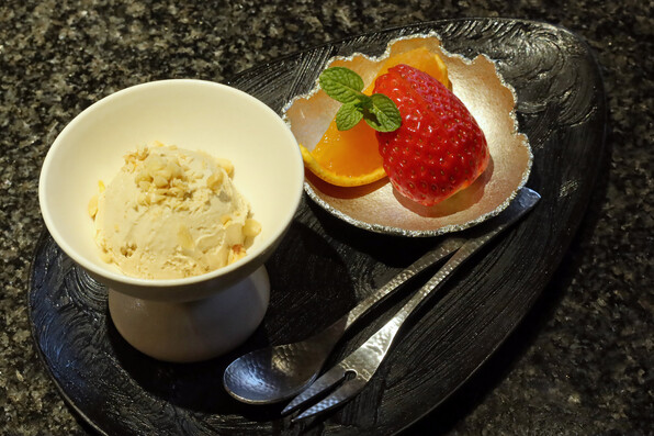 ●いちご(まりひめ)とオレンジ(せとか)に、自家製ほうじ茶アイスクリーム、上に松の実。