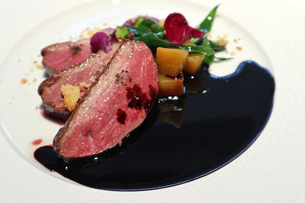 ●高知産の鴨のロティ、九条ねぎのソテ。バルサミコ赤ワインソース