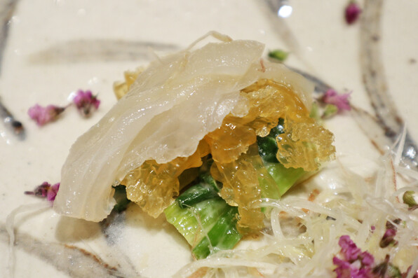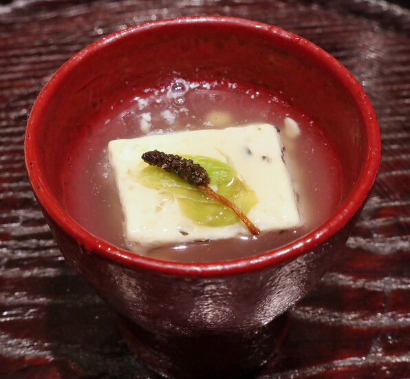 最初のひと品は、きくらげ豆腐 銀あん。ふきのとう、つくし