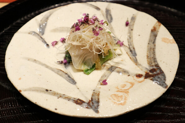 ●ぬた和え。かわはぎ、くらげ、わけぎ、白髪ねぎ、花穂紫蘇。唐辛子オイルの風味。
