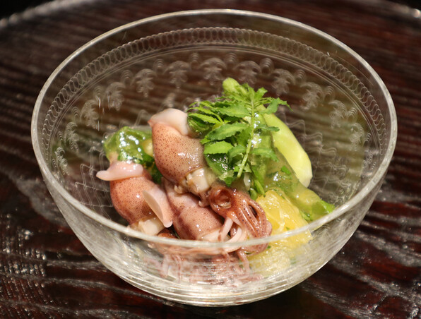 ●酢の物はほたるいか、うど、ふき、うるい、こごみ、柑橘 木の芽土佐酢ジュレ和え