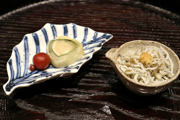 ●生姜をのせた釜揚げしらすと、大根ビール漬けキャベツ巻きと小梅甘酢漬け