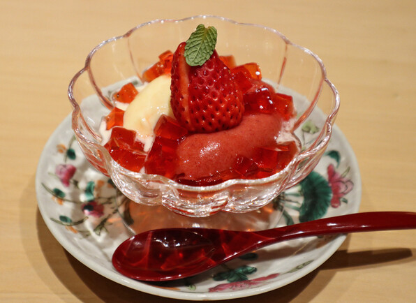 ●水物にいちごです。あまおう、あまおうのソルベ、ミルクアイスクリーム、いちごのジュレ。