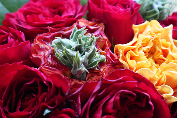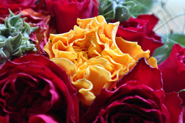 ●この濃厚な黄色のが、マンゴーリーバーで、赤いアレンジメントにアクセントを与えてくれました。