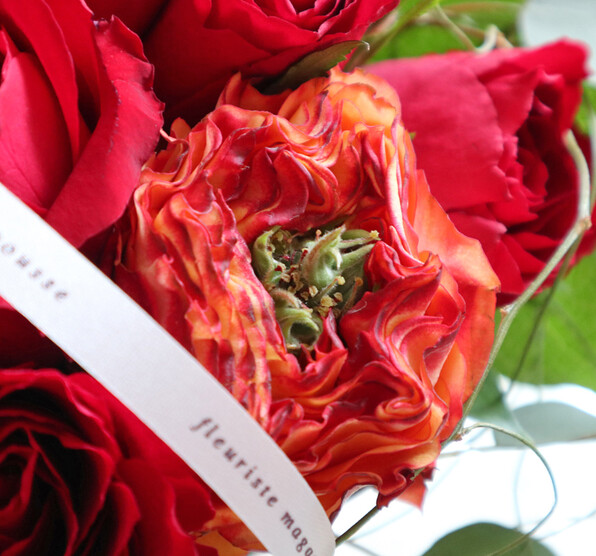 今回作ってもらったアレンジメントは、マッカなばらに、マンゴーリーバという本当にマンゴー色の大輪のばらと、フラッシュアイという綠色の花芯の印象鮮烈なばらをあしらったものでした。