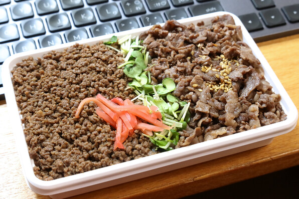 ●ある日のデスクトップごはん。「三嶋亭」さん、大丸地下のイートインの牛そぼろ弁当 1188円也です(^o^)/