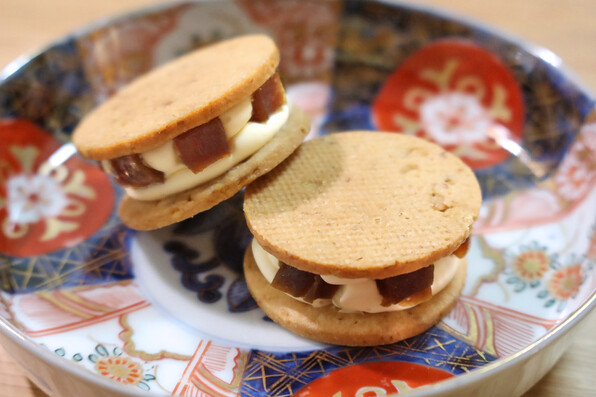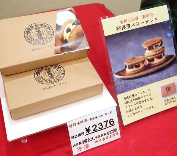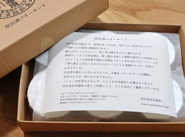 ●つい先ごろ発売になった、奈良漬バターサンドという新商品。バタークリームに奈良漬を合わせてサブレでサンドイッチにしたというものです。