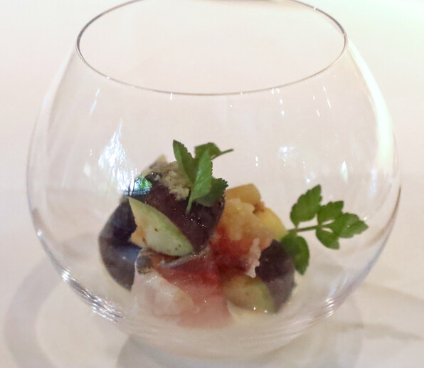 ●水茄子のぬか漬けにむろあじ 生姜ソース、鮒ずしの飯・・・と発酵ものをかけ合わせた一品。