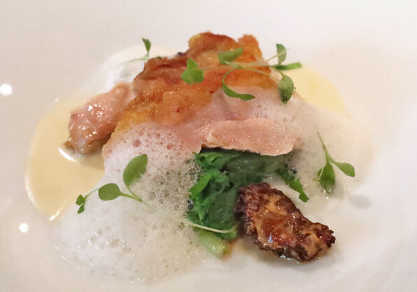 ●Pantade、パンタード=ほろほろ鳥です。ヴァンジョーヌ風味、胡椒の泡。モリーユ。