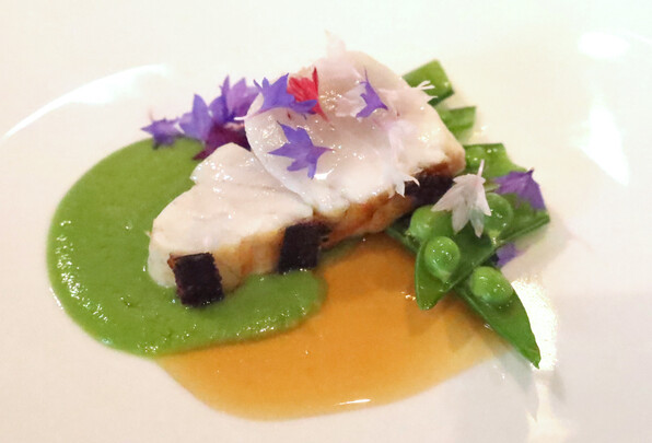 ●ひらすずきは鳥取産ということ。「南海みどり」という品種のえんどう豆のソースに、透明なのが野菜のエキスソース。絶句するほど美味でした。