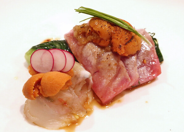 ●炙ったまぐろ、うに/やがら、牡丹海老、うに 蛇腹きゅうり