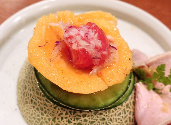 ●ハムをめくるとトマトです。トマトの旨味とメロンの甘さ、ハムの塩気で、もうここまでで十分幸せです。