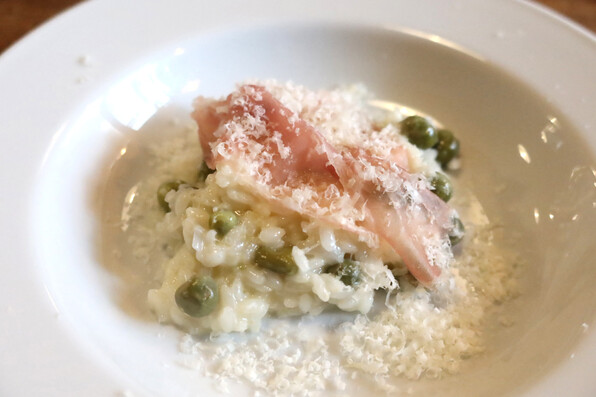 ●えんどう豆のリゾット、プロシュートと。