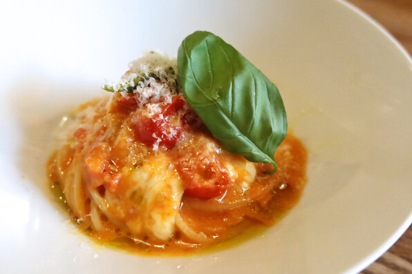 ●めっちゃ甘いトマト(というメニュー名)、水牛モッツァレッラ、バジルのスパゲッティ