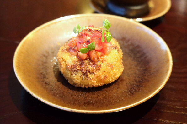 ●賀茂茄子のクロケットは、昨年の賀茂茄子のカツレツとは全然違うもので、よくまあこの構造で、食感を生かすべく茄子そのものをまとめられたなあと驚きました。作り方を伺ってやはり相当な工夫があることがわかりました。家ではできませーん。これだけでもまたいただきに伺いたいです。