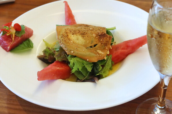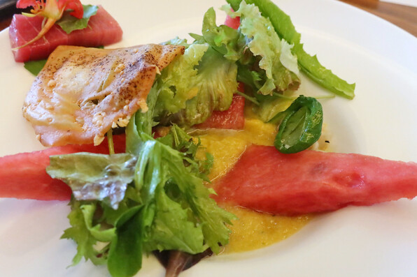 ●イエローガスパチョに、赤い食材とサラダがのってきたひと皿め。これが最も印象に残りました。