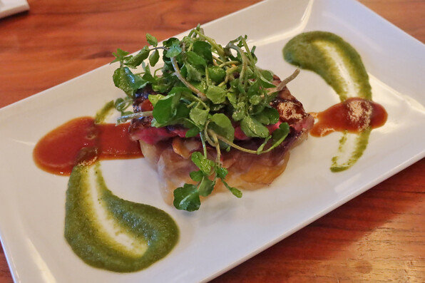 万願寺とうがらしソースと、フォンドヴォーのソース。肉の下にインカのめざめとシャドウクイーン(じゃがいも)。