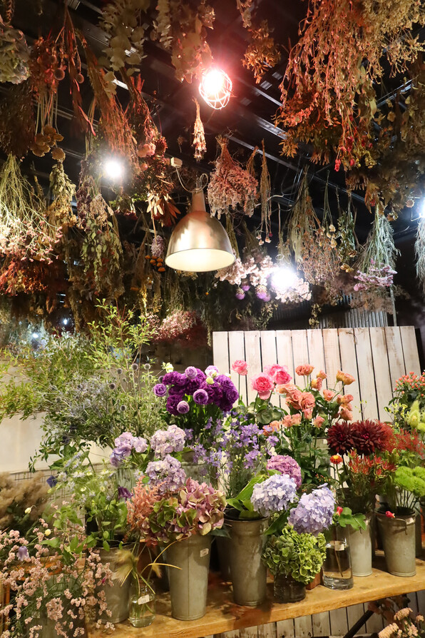 ●おびただしいドライフラワーに、あじさいなど季節の生花もたくさん。ただし真っ赤な花は残念ながらなくて・・・